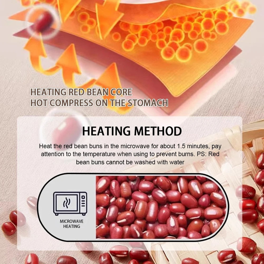 The red bean heat core can be gently warmed in the microwave for about 1–1.5 minutes.